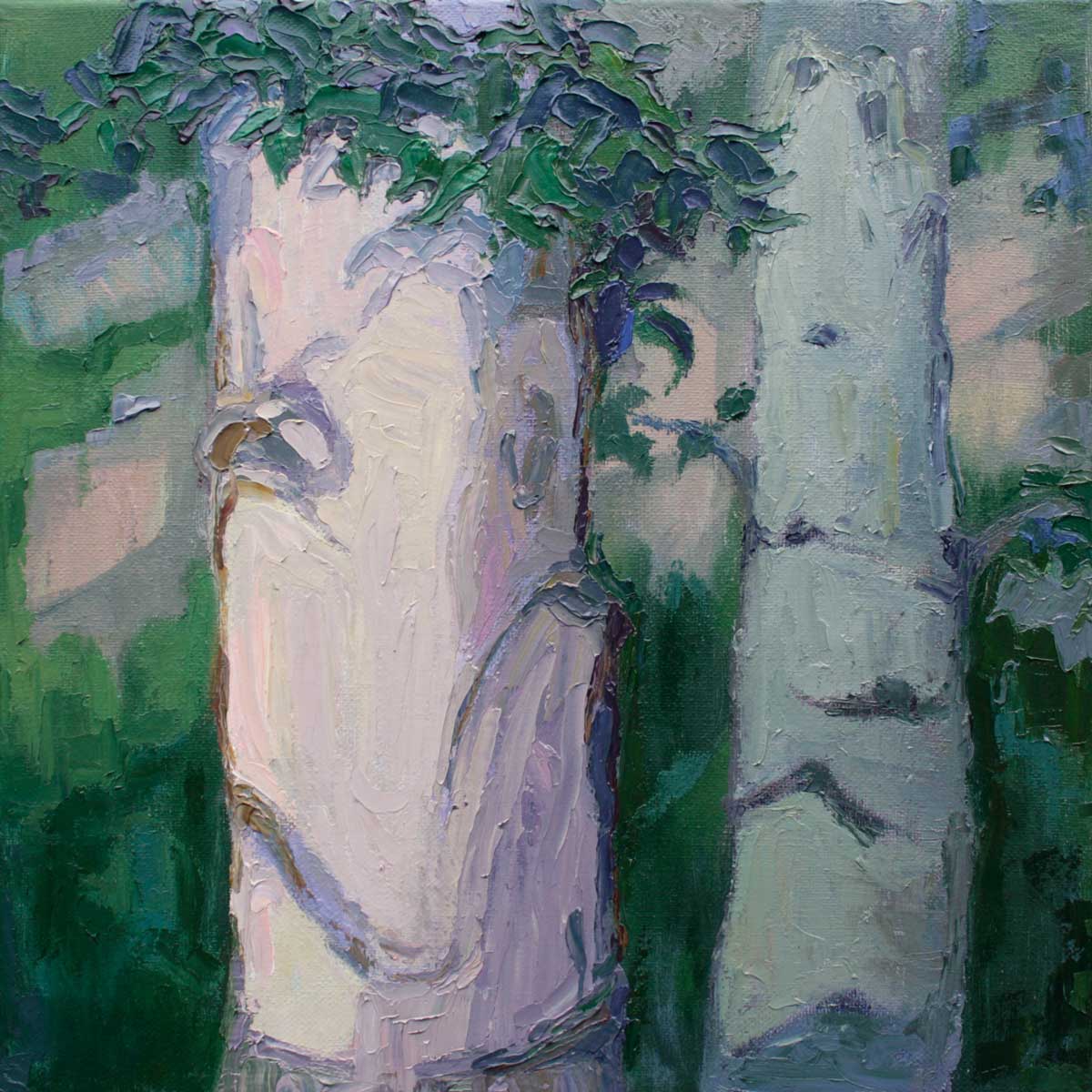 White alder (Alnus rhombifolia): Painted in the bottom of Big Santa Anita Canyon (near Arcadia, CA), where the year-round creek provides the perfect habitat for this species, at least in Southern California. White alder likes abundant water and forms copses in canyon bottoms. The multiple trunks—tall and straight, with a smooth, sometimes peeling, creamy white bark—often seem to be in conversation with each other. A pattern of dark “eyes” marks where branches have dropped from the trunk. Leaves are a refreshing bright green with a distinct straight venation. Foliage turns tawny gold with cool weather, when leaves drop from the trees and carpet the forest floor.